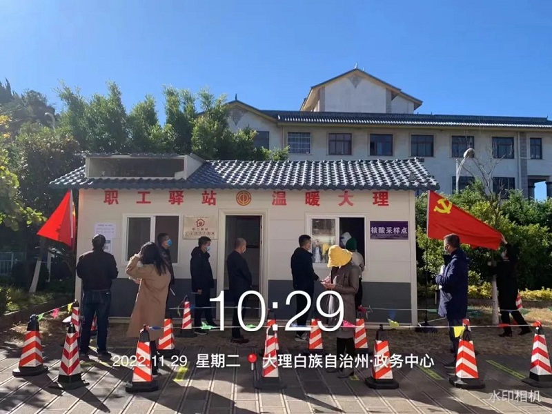 该座职工驿站由大理志昂保安公司负责具体建设和日常运营维护工作,于2022年6月投入使用,是供各单位户外劳动者及周边群众使用的一个工会户外劳动者服务站点。为保安员等新就业形态劳动者提供“冷了能取暖、热了能乘凉、雨天能避雨、渴了能喝水、累了能歇脚、饭凉能加热、手机能充电、免费能上网”的关爱服务。